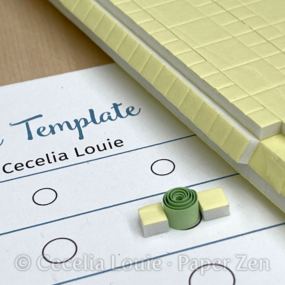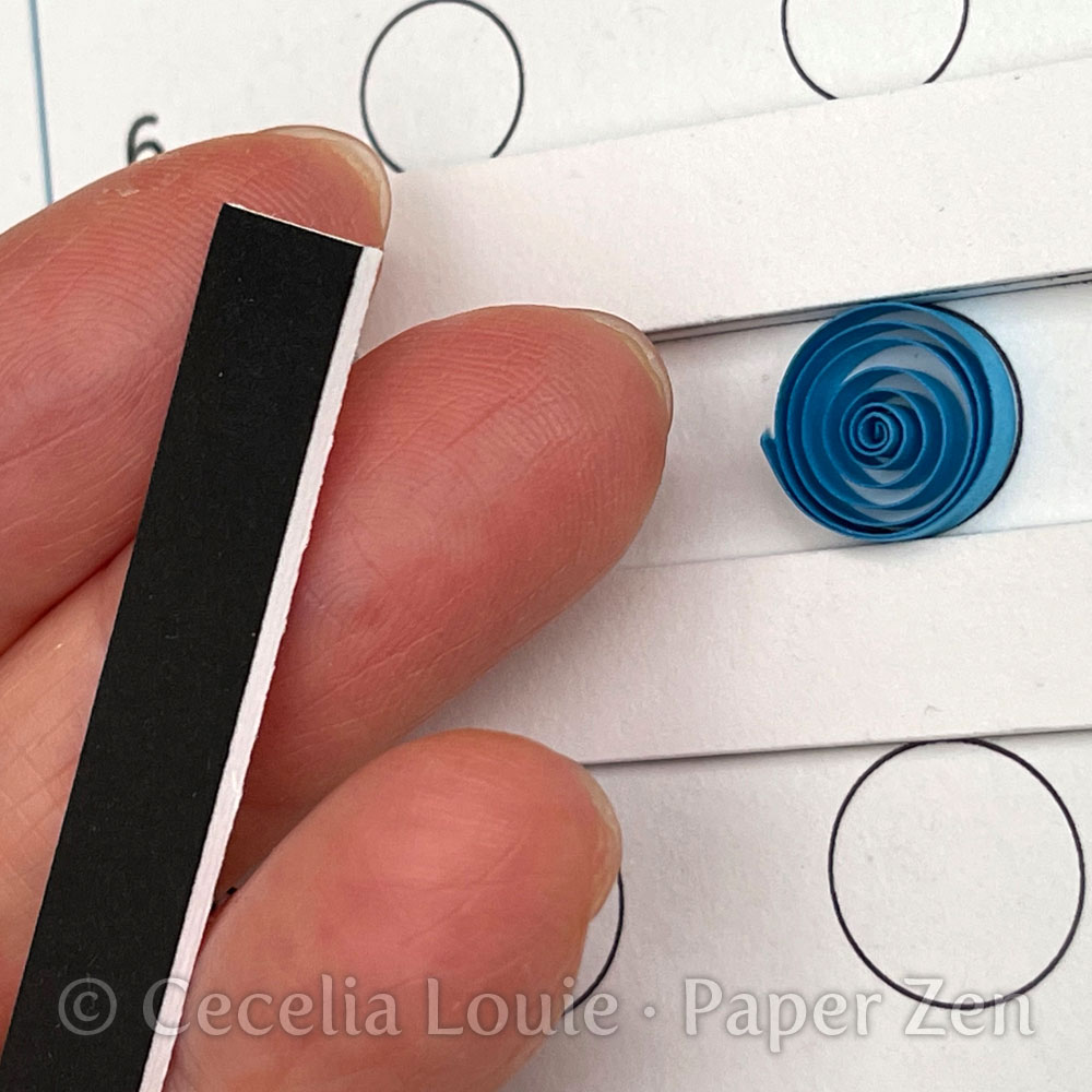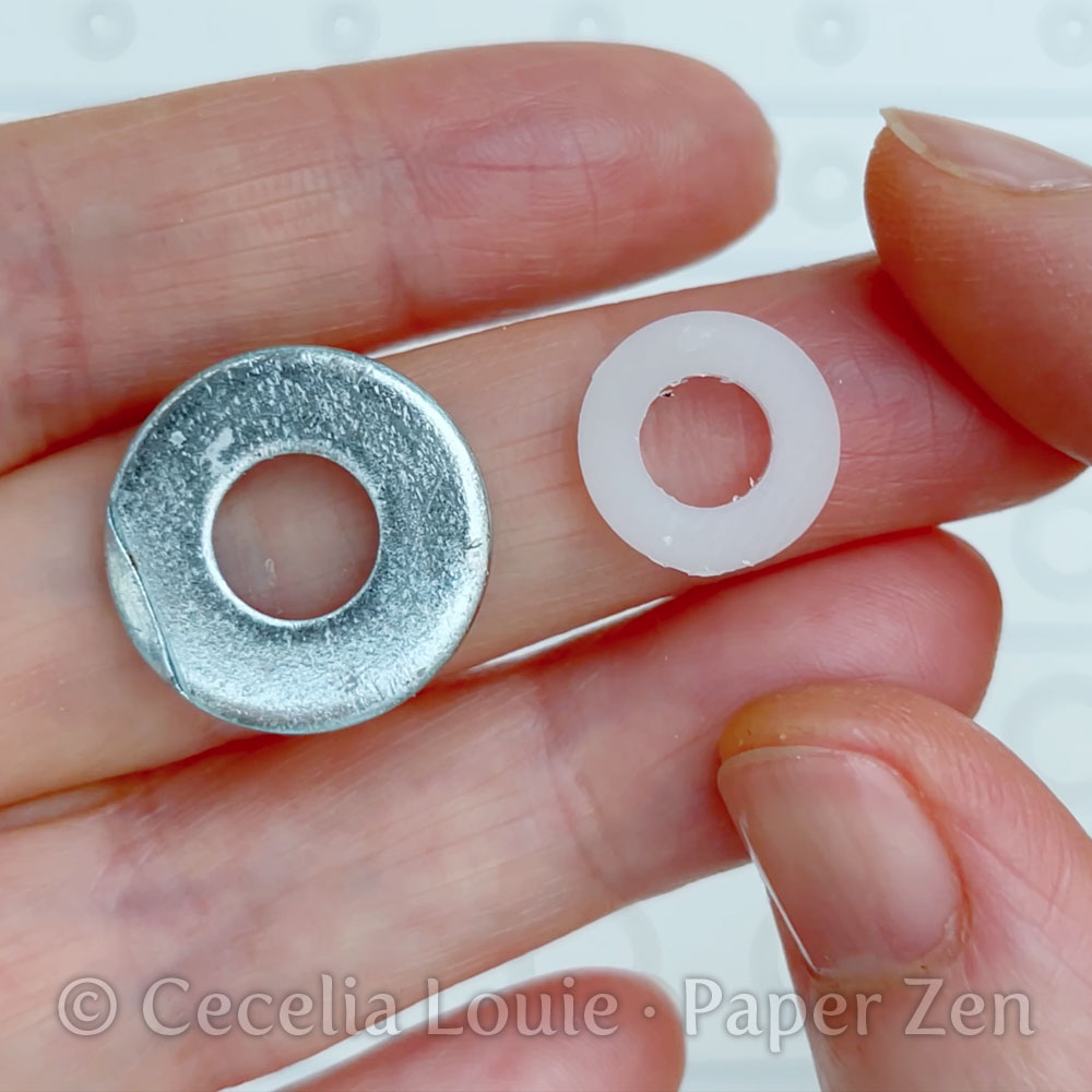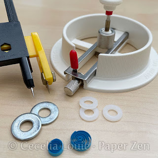 Nylon or metal flat washers are inexpensive items at a hardware store. Match up the inside circumference and glue them down with Scotch Quick-Dry Adhesive, ideal for gluing metal or plastic embellishments. I only dab a little glue to avoid it squishing out from the bottom. The depth of the washers seemed just right for 1/8” width quilling paper strips. I even stacked two nylon washers together for 1/4” width coils, and it seemed to hold.