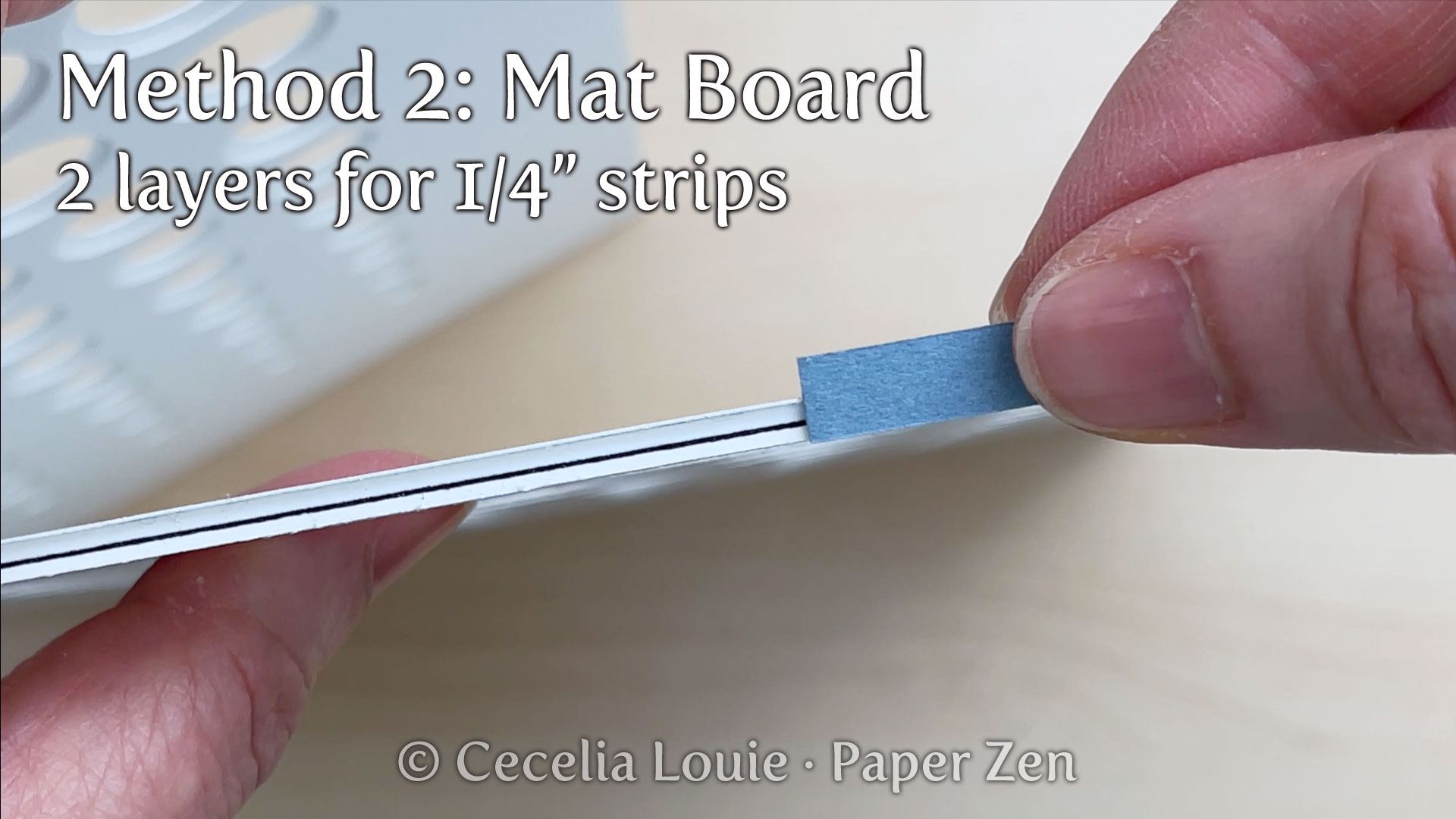 - Glue all the layers together and let the template dry overnight under a stack of books to ensure your template will not have any bowing. I cut mine from 2 sheets of mat board for 1/4" wide quilling strips.