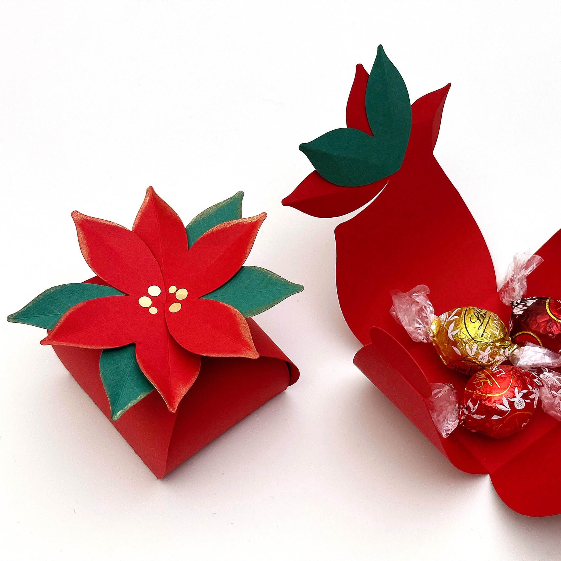 Make a quick and easy poinsettia flower gift box for Christmas parties. Watch the assembly video to see how simple it is to make a festive impression. Free template patterns for electric cutting machines and hand cutting.
