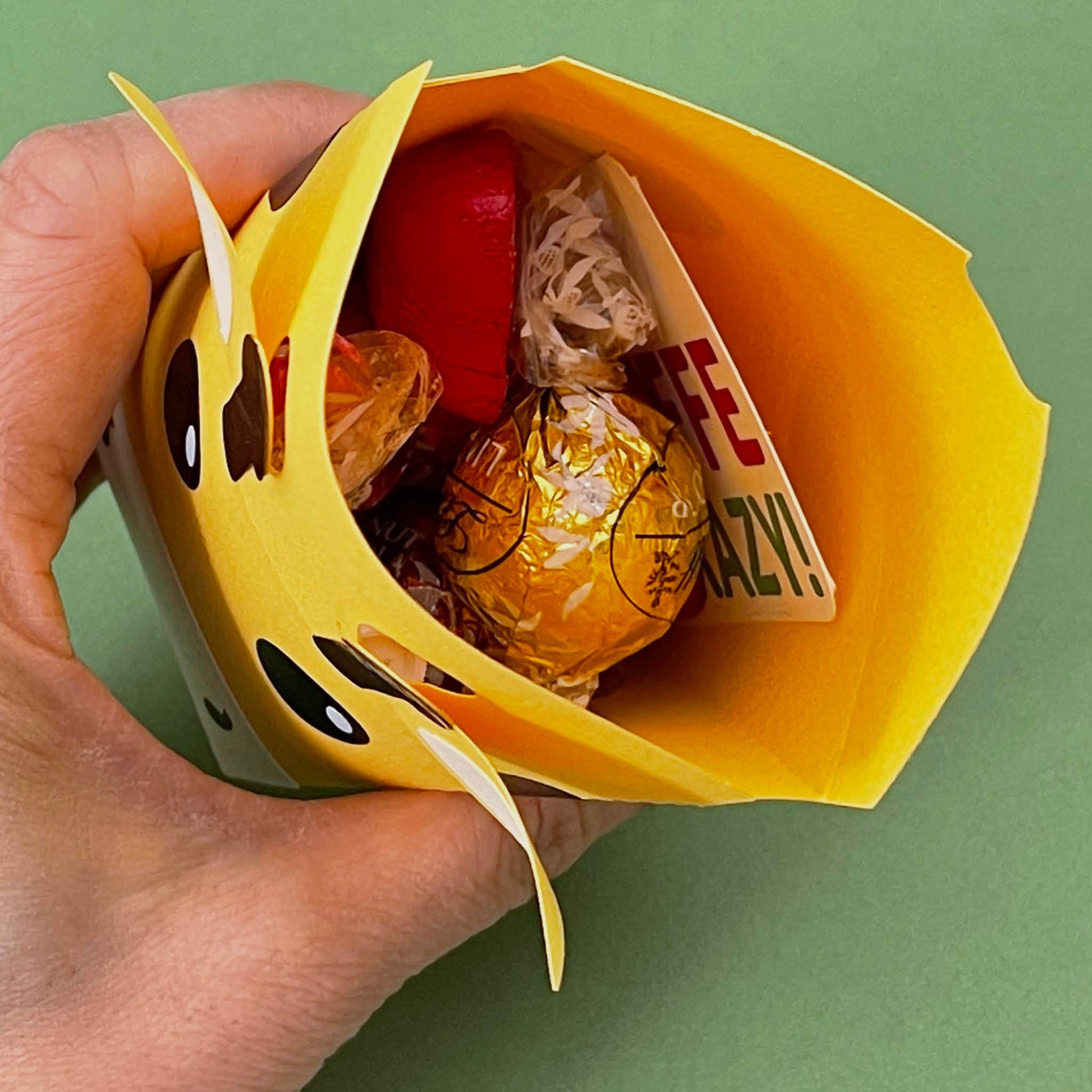 Just glue one tab, fold the bottom, and you’re ready to stuff your giraffe box with joy.