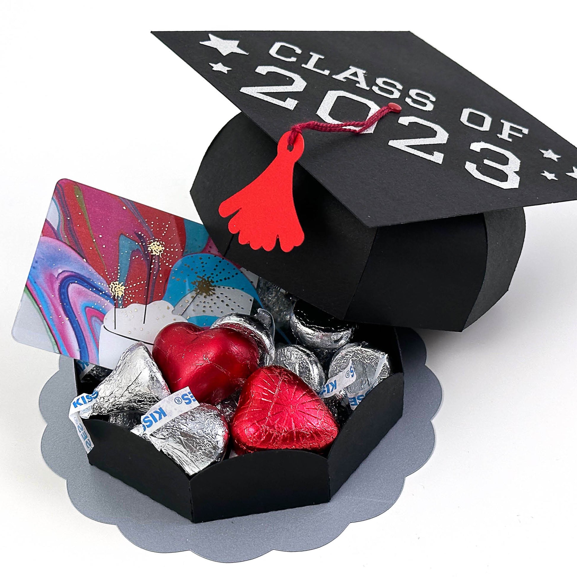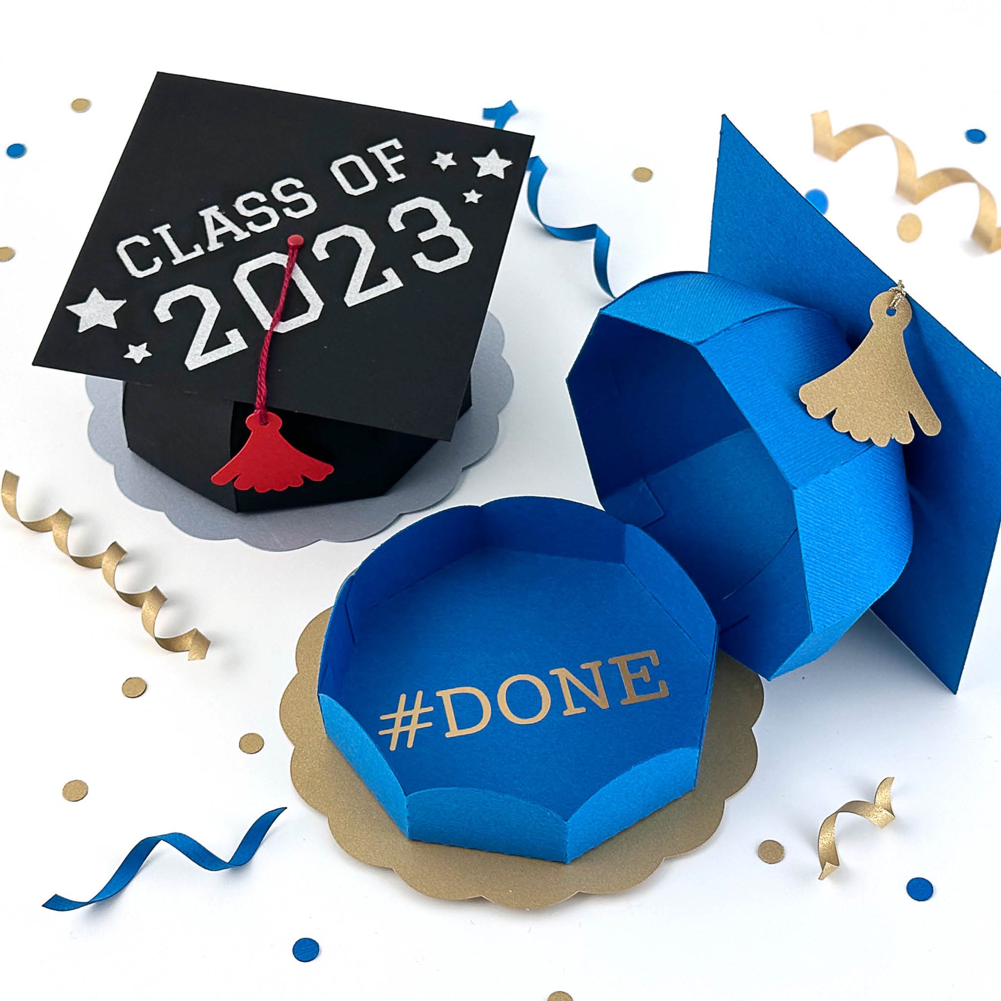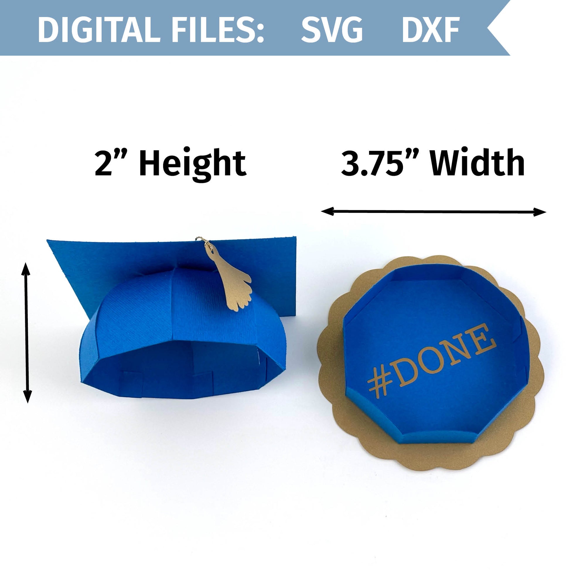 Congratulate your future graduates with a unique grad cap box. With ample space to hold a gift card and candies, this box will definitely give your guests an unforgettable memento of this milestone event. It’s easy to assemble - just follow along the step-by-step assembly video. This digital SVG file is the perfect DIY project to make your party a hit!