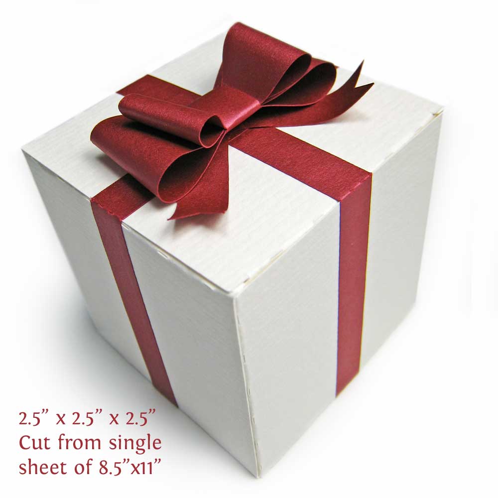 Decorate the classic cube box with my version of the perfect paper bow – never crushed, always centered, double loops tilted just so, with no glue needed – just one single piece of paper by the way.