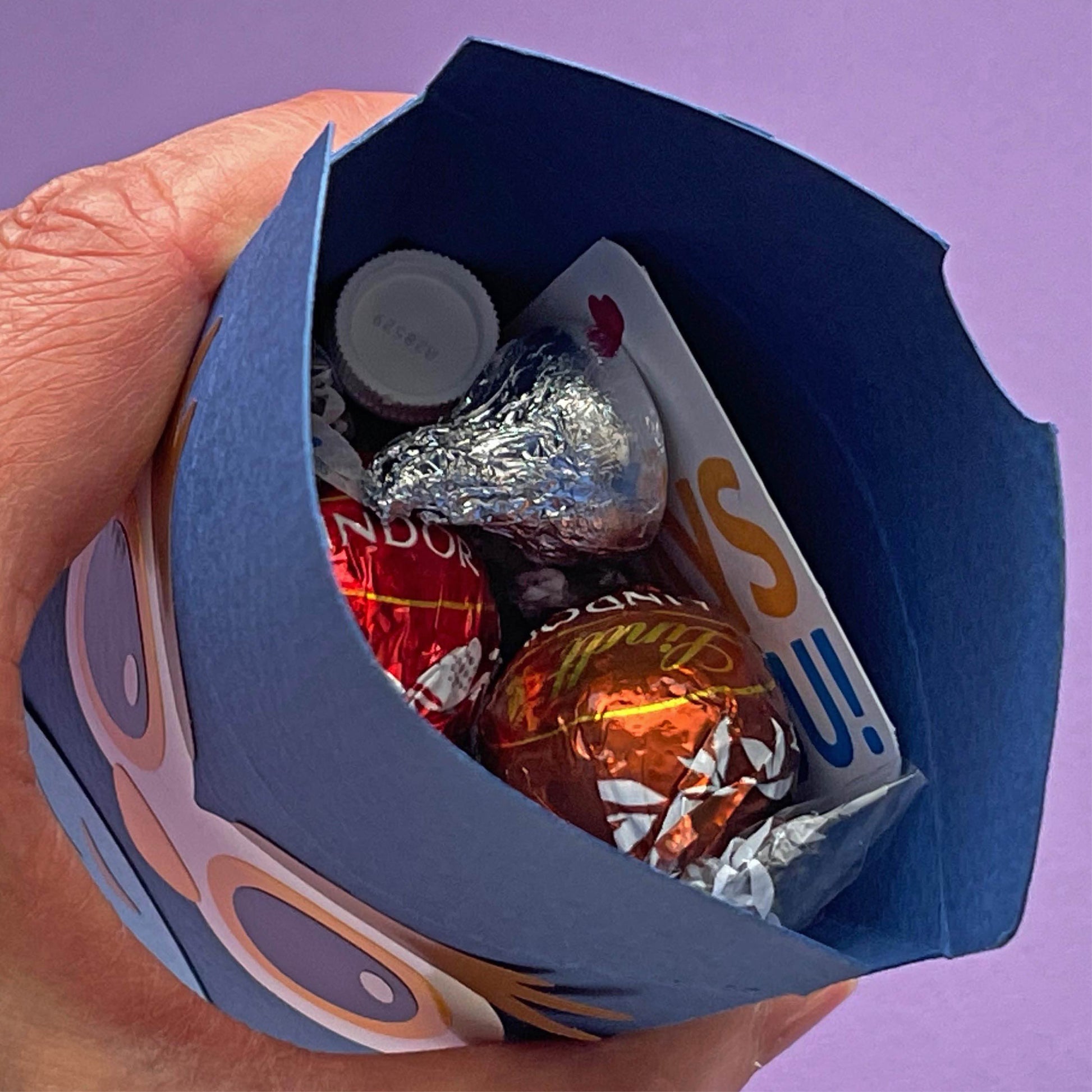 Just glue one tab, fold the bottom, and you’re ready to stuff your owl box with joy.